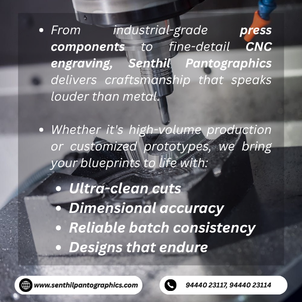 • From bold press components to intricate CNC engraving, Senthil Pantographics is where engineering meets excellence. Whether it's mass production or custom prototyping, our precision-driven process ensures every cut, every punch, and every piece stands the test of time.